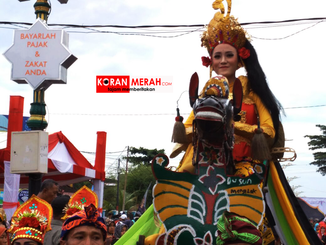 Egiddya Cahyasari saat menaiki jaran kamput mewakili kecamatan praya barat dalam ajang Mandalika Fashion Carnaval 2018 di Lombok Tengah,senen (5/3/2018).