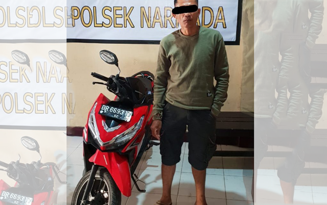 Polsek Narmada berhasil meringkus terduga pelaku tindak pidana penggelapan Sepeda Motor. Pelaku yang berinisial H(46) berhasil ditangkap di Dusun Pemunut, Desa Suranadi, Kecamatan Narmada, Kabupaten Lombok Barat pukul 10.00 WITA (22/6).