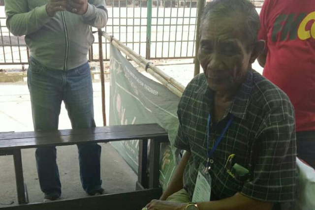 Mustafa (61), seorang anggota Linmas Kelurahan Sungai Jawi Luar, Kecamatan Pontianak Barat tanpa sengaja meminum tinta celup yang ditaruh dalam wadah bekas kemasan air mineral saat Pilkada Serentak, Rabu (27/6/2018). Hal tersebut dilakukan Mustafa lantaran rasa kantuk yang mendera dirinya karena berjaga TPS semalaman jelang pencoblosan. Saat itu, kondisi warga yang akan melakukan pencoblosan di TPS 01 yang dijaganya sedang ramai antrian.