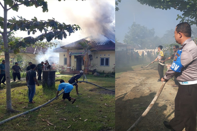 Puskesma Gunung Sari, Lombok Barat terbakar. polisi dan TNI berusaha memadamkan api