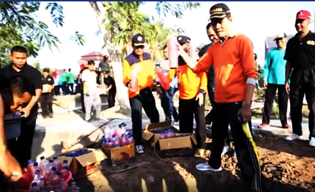 Dipimpin oleh Sekda HM. Nursiah , Pemda Lombok Tengah, NTB bersama Pol PP dan Polres memusnahkan ratusan botol minuman keras berjenis tuak dan berem di alun alun tastura, lombok tengah (20/7).Pemusnahan ini dilakukan dengan cara memasukkan cairan minuman keras tersebut ke dalam lubang yang sudah disediakan di areal itu.