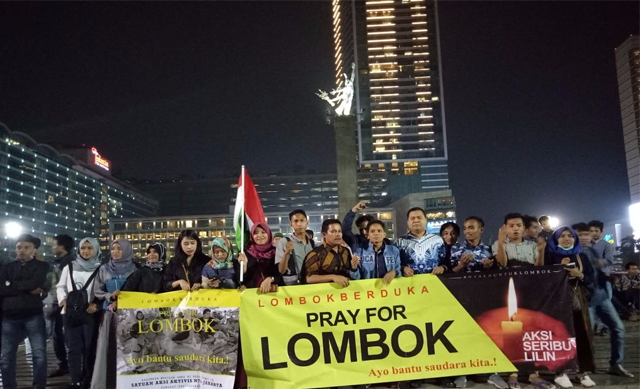 Aksi solidaritas bakar 1000 lentera lilin dengan tema nyala untuk lombok dibunderan Hotel Indonesia Kamis malam ( 9/8) . Mereka menghimpun dalam Satuan Aksi Aktivis Nusa Tenggara Barat (SAKTI-NTB) yang terdiri atas Orda, Ormas, Mahasiswa, Dan Aktivis sejabodetabek,