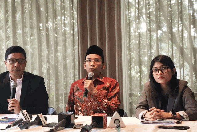 Zaenul Majdi saat memberikan keterangan pers membantah korupsi divestasi newmont