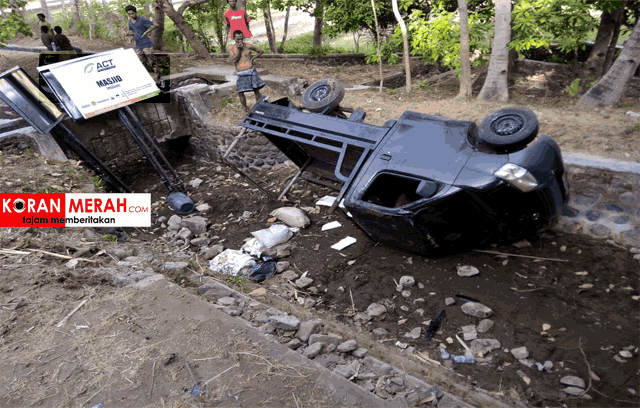 Pantauan di lapangan, Mobil pick up tersebut masuk sungai dan terbalik sedalam 3 meter. sementara muatannya berupa plang papan nama masjid dan beberapa material bahan bangunan juga berjatuhan. Rencananya plang masjid tersebut akan diantar ke beberapa masjid yang ada di kecamatan pemenang milik organisasi Aksi Cepat Tanggap ( ACT ).