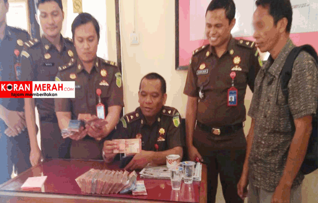 Mantan Bendahara Desa Pengembur saat mengembalikan uang hasil penyelewangan APBDes