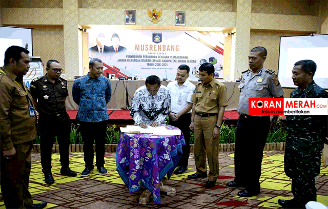 Wakil Bupati Loteng, L.Pathul Bahri saat menandatangani dokumen pada Musrenbang Revisi RPJMD Loteng 2016-2021