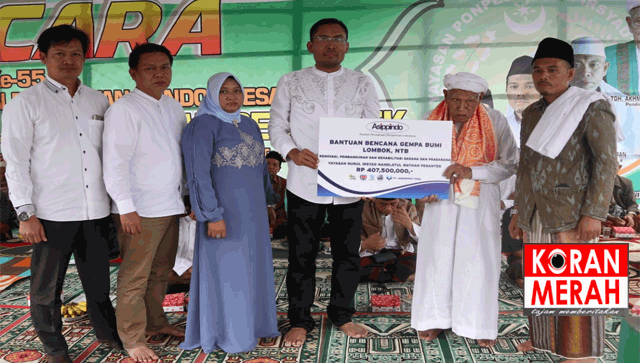 Penyerahan bantuan dana pembangunan sarana pendidikan oleh Asippindo saat Haul Ke-55 Ponpes Nurul Irsyad Pesantek, Setiling, Lombok Tengah