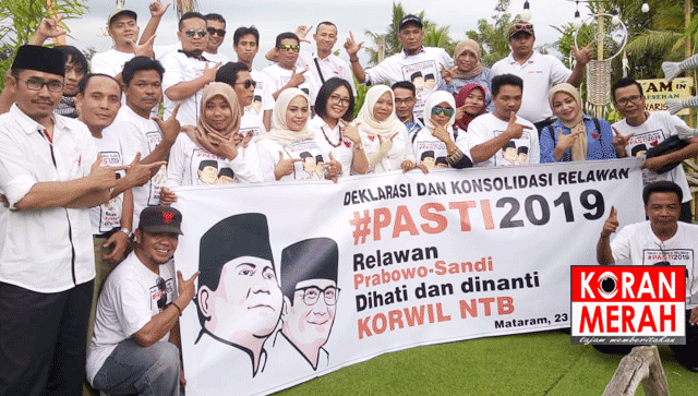 Puluhan relawan Prabowo-Sandi NTB menggelar deklarasi dukungan kepara kepada Capres no.02 itu. Mereka tergabung dalam relawan Relawan Pasti, Prabowo Sandi, Di Hati dan Dinanti, [Relawan Pasti] Korwil NTB. Mereka mengikrarkan untuk bekerja maksimal guna memenangkan Prabow-Sandi di NTB.