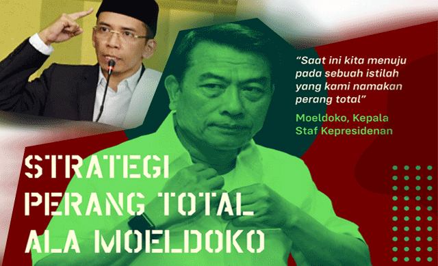 Namun dalam kesempatan lain, Wakil Ketua TKN yang juga merangkap sebagai Ketua Harian TKN, Moeldoko menyampaikan, timses Jokowi-Ma’ruf Amin tengah bersiap untuk ‘perang total’.