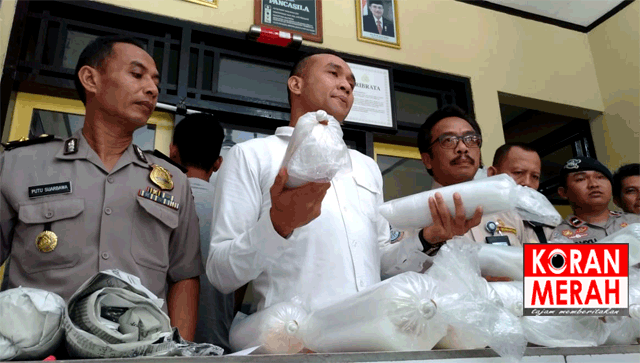 Polda NTB saat memamerkan barang bukti dan tersangka penyelundupan bibit lobster