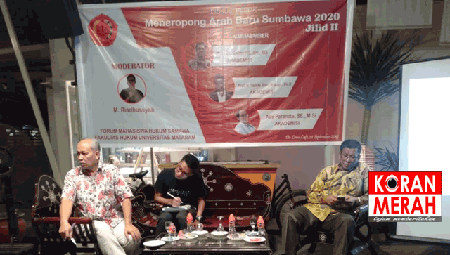 Diskusi bertajuk “Meneropong Arah Baru Sumbawa 2020 Jilid II,” dimoderatori M. Riadhussyah menghadirkan dua akademik sebagai narasumber. Masing-masing adalah Prof. Dr. Salim HS, SH., MS, dan Prof. Ir. Taslim Sjah, M.App., Ph.D.