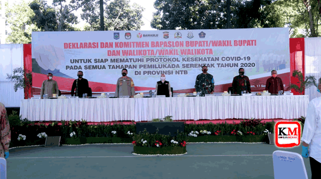 Satu langkah progresif penanganan Covid-19 tercipta di Lapangan Tenis Mapolda NTB Kamis (19/7). Di tempat itu, terjadi penandatanganan deklarasi yang menyatakan bahwa semua bapaslon yang akan maju di pemilukada harus bertanggung jawab terhadap masa pendukungnya.