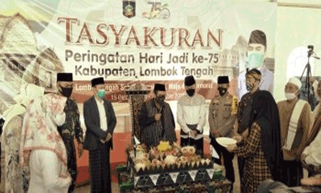 Rangkaian Tasyakuran Hari Jadi ke 75 Kabupaten Lombok Tengah diawali dengan Zikir dan Do’a. Dilanjutkan dengan pemotongan Nasi Tumpeng oleh Ketua DPRD Lombok Tengah M. Tauhid dan pemberian santunan kepada Anak Yatim.