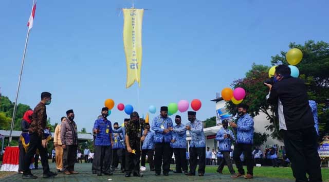 Upacara yang dimulai pukul 08.30 wita ini tetap memperhatikan protocol kesehatan pencegahan Covid-19. Para peserta diwajibkan mencuci tangan, memakai masker yang dibagikan gratis dan baris berjarak.