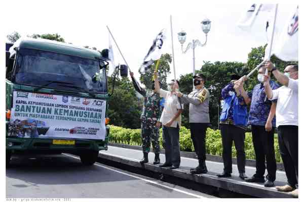 Aksi bantuan kemanusiaan dalam wujud bantuan Sembako dari para Dermawan Lombok-Sumbawa bagi masyarakat Majene, Mamuju, Sulawesi Barat (Sulbar) yang beberapa waktu lalu tertimpa musibah gempa kembali dilakukan, Kamis (25/2/2021) ditandai Pelepasan Bantuan Kapal Kemanusiaan Lombok Sumbawa Dermawan oleh Gubernur NTB, Dr. H. Zulkieflimansyah, M.Sc bersama Kapolda NTB, Irjen. Pol. Mohammad Iqbal, MH, Danrem 162/WB Brigjen. TNI Rizal Ramdhani, SH, MH dan Kepala OPD terkait lingkup Pemprov NTB.