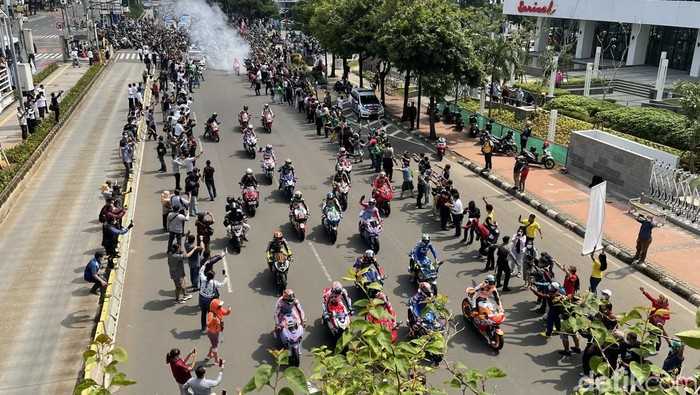 Parade pembalap MotoGP yang diikuti Marc Marquez dan kawan-kawan di Jakarta disambut warga dengan meriah. Parade ini dimulai dari Istana Negara menuju Bundaran HI dan finis di Hotel Kempinski pada Rabu pagi, 16 Maret 2022.