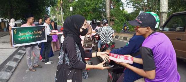 Bank NTB Syariah membagikan paket berbuka puasa untuk masyarakat, Selasa sore 12 April 2022, di kawasan jalan Bung Karno, Kota Mataram.