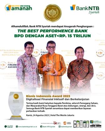 Bank NTB Syariah berhasil meraih penghargaan prestisius sebagai The Best Performance Bank untuk kategori Bank Pembangunan Daerah (BPD) dengan aset kurang dari Rp15 triliun dalam ajang Bisnis Indonesia Financial Award (BIFA) 2023.