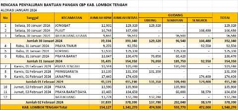 Untuk hari ini, Pemerintah Daerah Lombok Tengah menyalurkan bantuan pangan ke tiga kecamatan, yaitu Kecamatan Jonggat, Kecamatan Pujut, dan Kecamatan Batukeliang Utara. Adapun alokasi tonase bantuan untuk masing-masing kecamatan adalah 129.320 ton untuk 12.932 Keluarga Penerima Manfaat (KPM) di Jonggat, 167.480 ton untuk 16.748 KPM di Pujut, dan 96.540 ton untuk 9.654 KPM di Batukeliang Utara. Total keseluruh untuk kabupaten Lombok Tengah sebanyak 1.541.270 ton untuk 154.127 KPM.