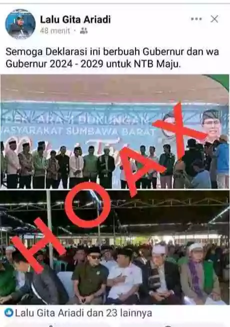 “Kami pastikan ini akun palsu dan postingannya hoax yang sengaja dibuat oleh orang yang tidak bertanggung jawab. Pj Gubernur NTB baik secara lisan maupun tertulis di seluruh platform media tidak pernah memberikan dukungan apapun atas deklarasi pilkada bakal calon Gubernur NTB 2024”. Ujarnya di Ruang kepala Dinas Kominfo NTB.