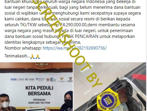 Dalam unggahan tersebut, disebutkan bahwa bantuan ini bersifat resmi dan semua TKI wajib menghubungi pihak pencairan melalui nomor WhatsApp untuk mendapatkan dana tersebut. Narasi ini juga mencatut nama instansi Kemenkes dan mengatasnamakan bantuan sosial untuk “membantu sesama WNI di luar negeri”.