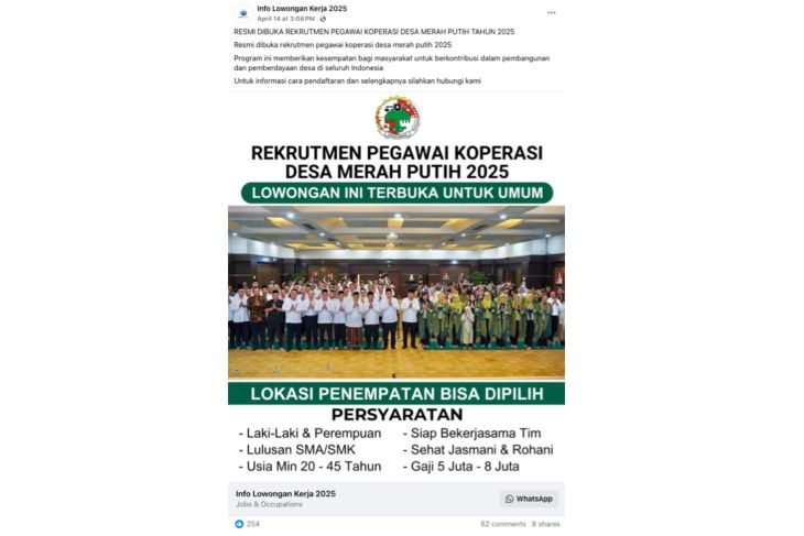 Informasi tentang rekrutmen pegawai Koperasi Desa Merah Putih tahun 2025 melalui tautan WhatsApp adalah tidak benar.