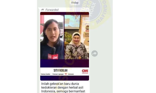 Video tersebut menampilkan beberapa tokoh publik, termasuk mantan Menteri Kesehatan Siti Fadilah Supari dan jurnalis CNN Indonesia, yang seolah sedang membahas produk herbal lokal sebagai terobosan medis terbaru.
