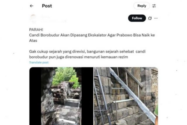 Beredar video di media sosial X (dulu Twitter) yang diklaim memperlihatkan pembangunan eskalator di kawasan Candi Borobudur. Unggahan tersebut dikaitkan dengan rencana kunjungan Presiden Prabowo Subianto bersama Presiden Prancis Emmanuel Macron ke Borobudur pada Minggu, 29 Mei 2025.