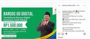 Sebuah unggahan akun Instagram pada 14 Mei 2025 menyebarkan informasi tentang pendaftaran bantuan sosial (bansos) dari Kementerian Sosial. Narasi unggahan tersebut berbunyi: