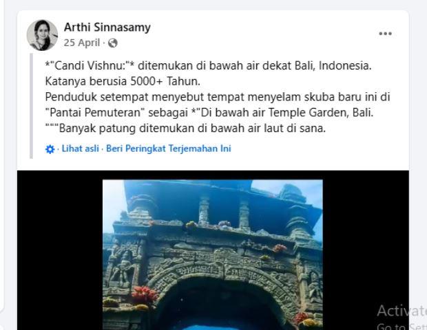 Sebuah video berdurasi 51 detik yang beredar di media sosial Facebook mengklaim adanya penemuan Candi Wisnu di dasar laut Bali. Candi tersebut disebut-sebut berusia lebih dari 5.000 tahun dan berada di kawasan Pemuteran, Bali. Klaim ini diunggah pada April dan Mei 2025 oleh akun Facebook bernama Arthi Sinnasamy dan Khritish Parmar.