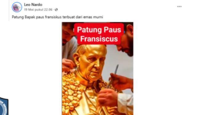 Sebuah video yang diunggah akun Facebook bernama “Leo Nardo” pada Senin, 19 Mei 2025, menampilkan proses pembuatan patung Paus Fransiskus yang disebut terbuat dari emas murni. Narasi dalam video menyebut, “Patung Bapak paus fransiskus terbuat dari emas murni.”