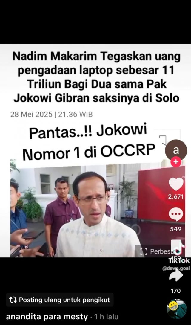 Beredar sebuah tangkapan layar (screenshot) dari unggahan akun TikTok bernama Abandita Para Mesty (tautan: https://vt.tiktok.com/ZSkNRLau2/) yang menyebut bahwa mantan Menteri Pendidikan, Kebudayaan, Riset, dan Teknologi (Mendikbudristek), Nadiem Makarim, mengakui adanya pembagian uang hasil korupsi pengadaan laptop senilai Rp11 triliun dengan Presiden Joko Widodo. Dalam unggahan bertanggal 28 Mei 2025 pukul 21.36 WIB itu, ditampilkan seolah-olah ada pemberitaan resmi dengan judul: “Nadiem Makarim tegaskan uang pengadaan laptop sebesar 11 triliun bagi dua sama Pak Jokowi, Gibran jadi saksinya di Solo.” Unggahan tersebut turut diberi caption oleh pemilik akun: “Pantas!! Jokowi nomor 1 di OCCRP.”