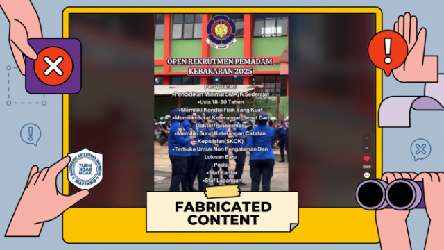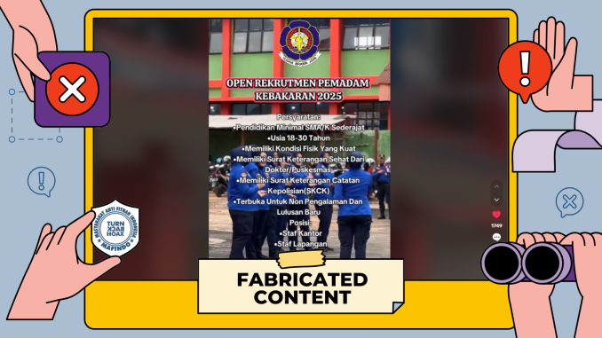 Hoaks – Konten Palsu (Fabricated Content). Unggahan rekrutmen pemadam kebakaran oleh akun TikTok “info.loker112” adalah tidak resmi dan menyesatkan. Rekrutmen pemadam kebakaran hanya dilakukan melalui kantor Damkar daerah untuk tenaga kontrak, dan melalui laman resmi pemerintah untuk formasi PNS dan PPPK.