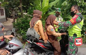 Koramil 1620-06/Jonggat Serma Saiful Rahman bersama babinsa melakukan imbauan kepada pelajar yang baru pulang dari sekolah agar selalu menggunakan masker dan membagikan masker kepada para pelajar yang tidak menggunakan, di depan SMPN 5 Jonggat jalan raya Barejulat Kecamatan Jonggat, Rabu tanggal 11 November 2020.