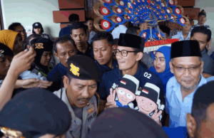Sandiaga Salahuddin Uno disambut ratusan pendukungnya saat tiba di Lembaga Permasyarakatan (Lapas) Mojokerto saat akan menjenguk Kepala Desa Sampang Agung, Kutorejo, Kabupaten...
